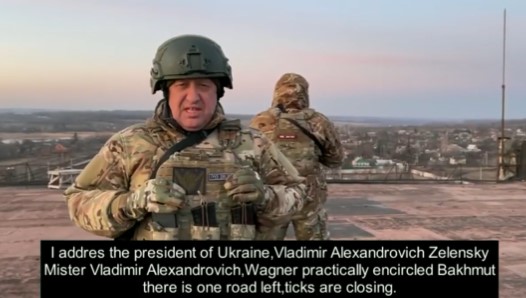 Евгениј Пригожин, основачот и шеф на руската платеничка организација Вагнер, во видеото објавено денеска изјави дека Бахмут е практично опкружен и дека Украинците имаат само еден излез од градот. Пригожин, исто така, го повика украинскиот претседател Володимир Зеленски да нареди повлекување на украинските сили од градот. Неговата порака можете да ја видите подолу.