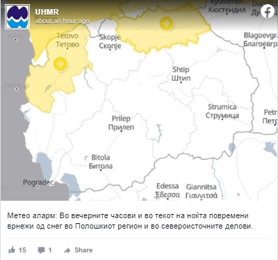 Под влијание на влажен и студен бран кон крајот на денов и во текот на ноќта во западните и северните делови ќе има локални врнежи од дожд, а на планините од снег. Поради заладувањето се очекува врнежите од дожд да преминат во снег и во некои од пониските места, соопшти УХМР.
