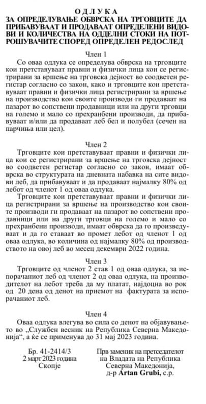 „Трговците кои претставуваат правни и физички лица регистрирани за вршење на производство кои своите производи ги продаваат на пазарот во сопствени продавници или на други трговци на големо и мало со прехранбени производи, имаат обврска да го произведуваат и ставаат во промет лебот од членот 1 од оваа одлука во количина од најмалку 80 отсто од производството на овој леб во декември 2022 година“, се посочува во одлуката.