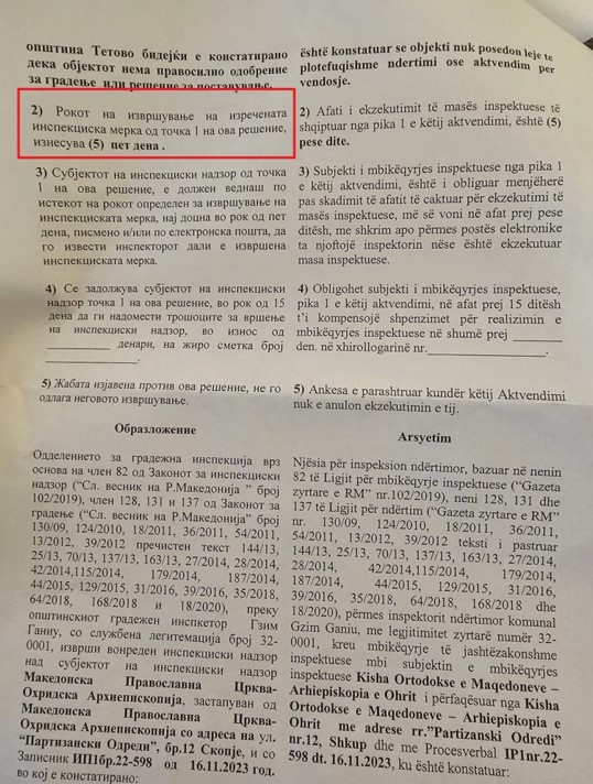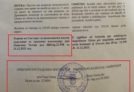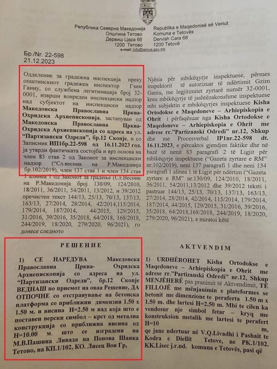 Инфомакс доби ексклузивни документи од решението со кое Општина Тетово ја предупредува Црквата да го отстрани крстот. Како што можете да забележите на фотографиите во продолжение, во решението се предупредува МПЦ да го отстрани крстот во рок од неколку денови, во спротивно Општината ќе отпочне активности за отстранување.