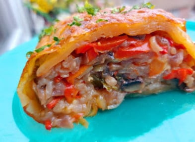 Печете ги компирите на 220 степени околу 15 минути. Извадете ги од рерна, а потоа посипете ги печурките и пиперката. Додадете рендан компир. Со хартијата полека виткајте го компирот. Врз компирите ставете малку сирење и печете уште 30-40 минути додека компирот убаво не порумени. Исечете кога ќе биде разладено. Фантазија.. Пријатно!