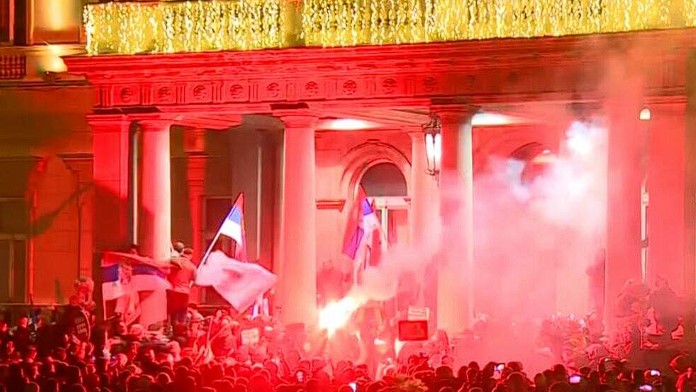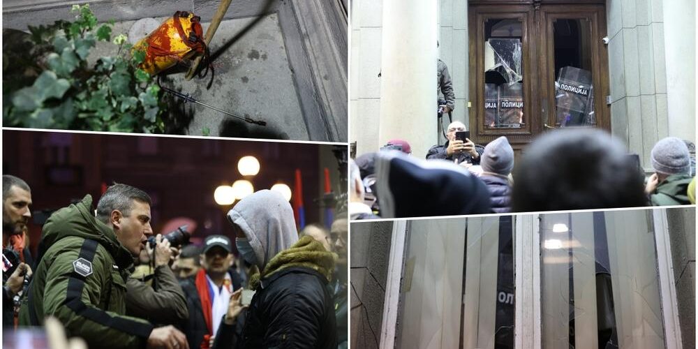 Вратите на белградското Собрание рано вечерва беа искршени, а беа измачкани со боја, а околу нив има предмети кои демонстрантите ги фрлаа кон полицијата.