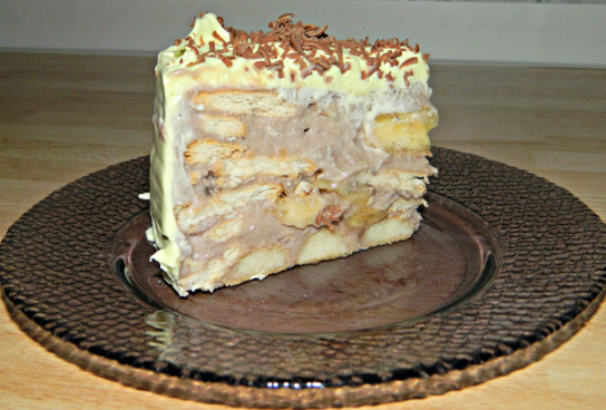 Шлагот изматете го со миксер. Премачкајте ја тортата откако сосема ќе биде изладена и декорирајте по вкус, чоколаден прелив, банани, рендано чоколадо…