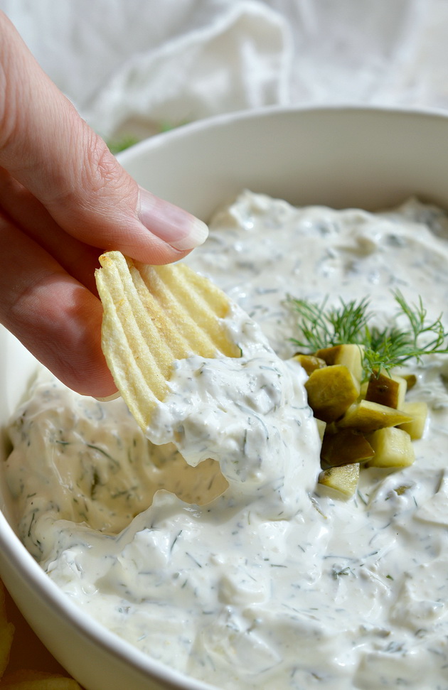 Измешајте ги сите состојки во една длабока чинија и послужете со чипс околу неа.