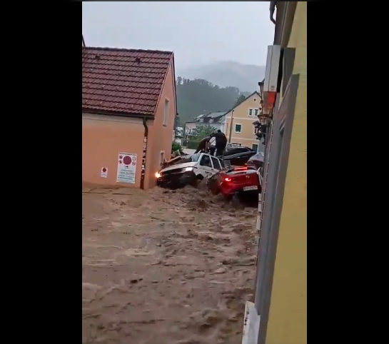 (Видео) Невреме во Австрија: Се излеа река, водата носи автомобили, во тек е евакуација