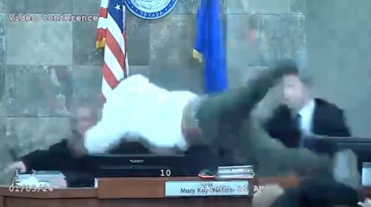 Full Uncensored video of a violent attack by a criminal defendant who leaped over the bench at District Court Judge Mary Kay Holthus.#Nevada #Judge #LasVegas pic.twitter.com/nS5YMOQiXa