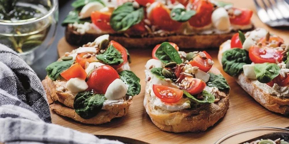 Исечете ја чабатата на малку подебели кришки. На добро загреана грил тава, на малку маслиново масло се пржат кришките од двете страни. За филот измијте ги и исушете ги мини доматите. Преполовете ги или исечете ги на четвртинки, во зависност од големината. Ситно исецкајте две чешниња лук. Во сад измешајте мини домати, сечканото козјо сирење (или сечканата моцарела), сечканиот лук, исечканите маслинки и искинатите листови босилек. Сè зачинете со сол, бибер и покријте со 4-5 лажици маслиново масло. Промешајте, па прелијте со потпечените парчиња леб.