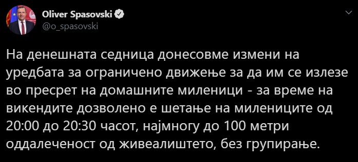 На денешната седница донесовме измени на уредбата за ограничено движење за да им се излезе во пресрет на домашните миленици – за време на викендите дозволено е шетање на милениците од 20:00 до 20:30 часот, најмногу до 100 метри оддалеченост од живеалиштето, без групирање.