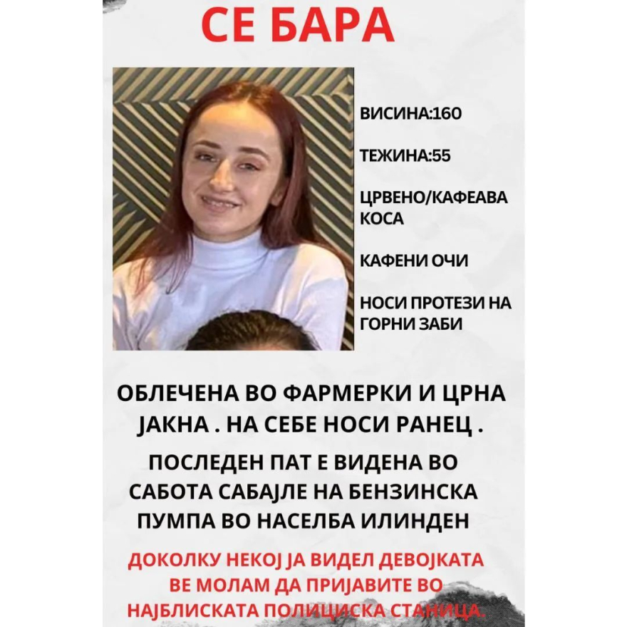 Црна хроника ВНИМАНИЕ: Исчезната е млада девојка во близина на Скопје Written by Леонардо More in Црна хроника: Насилство во Валандово: Маж ја претепал сопругата, нападнал полицаец, дома криел арсенал оружје 26.March.2026 ДЕТАЛИ ЗА ТРАГЕДИЈАТА: Жена и маж од Македонија загинаа во сообраќајна несреќа во Србија 21.December.2025 Стара жена најдена почината во својот дом во Гази Баба 28.September.2025 Млада девојка по име Ени е исчезната во близина на Скопје, последен пат е видена вчера наутро на бензинска пумпа во близина на Илинден. Пријателите и семејството апелираат доколку некој ја забележи да пријави во најблиската полициска станица. Пронајдете не на следниве мрежи: