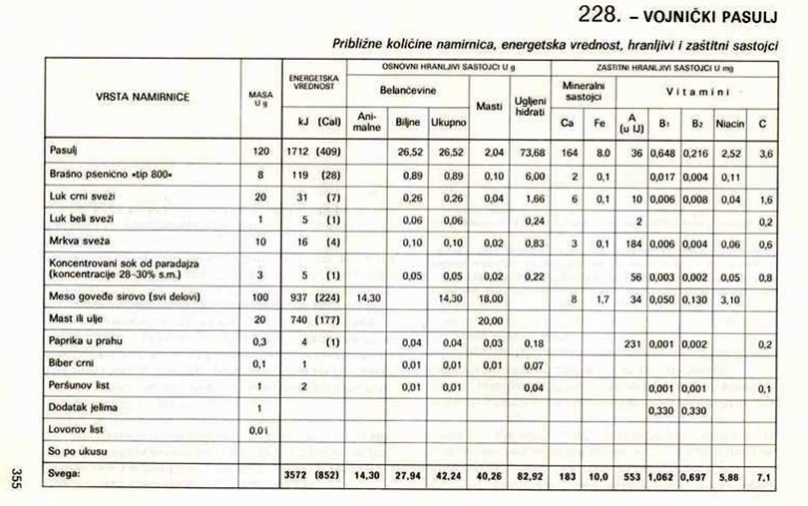 На веб-страницата JNA kuvar може да се најдат бројни рецепти за јадења достапни за војниците на Југословенската народна армија, вклучувајќи различни супи, чорби, јадења од риба и јадења со месо.