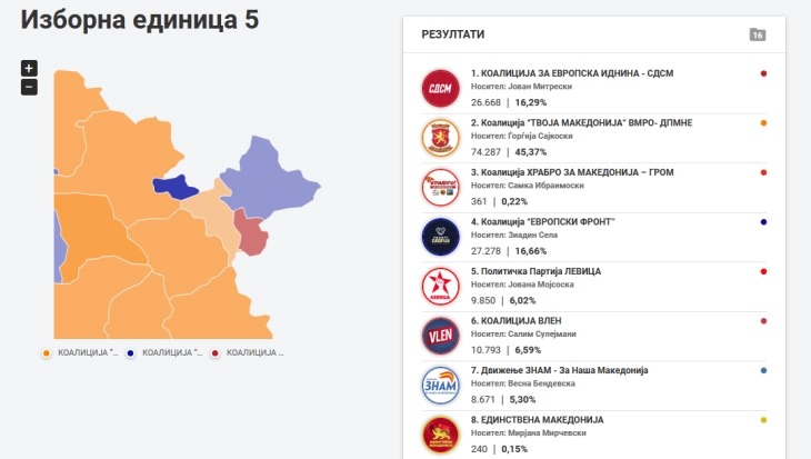 Во ИЕ 5 коалицијата „За европска иднина“ предводена од СДСМ на 8 мај имала 26 904 гласа, а сега, со денешното прегласување, има 26 668 или 236 гласа помалку, коалицјата „Твоја Македонија“ предводена од ВМРО-ДПМНЕ имала 73 916 гласови на 8 мај, а сега има 74 287 или 371 глас повеќе, коалицијата „Европски фронт“ предводена од ДУИ имала 27 013, а сега 27 278 или 265 повеќе, Левица имала 9 926, а сега 9 850 или 76 помалку, „Вреди“ имале 11 067, а сега 10 793 или 274 гласа помалку, движењето ЗНАМ имало 8 757, а сега 8 671 или 86 гласови помалку.