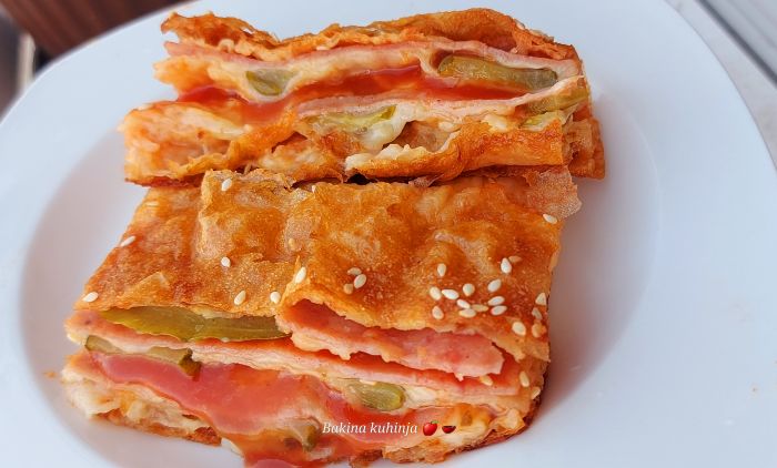 Се редат во плех и се покрива со остатокот од филот. Печете на 200 степени Целзиусови 45 минути додека убаво порумени. Сечете додека е топла питата. Уживајте во одличниот вкус.