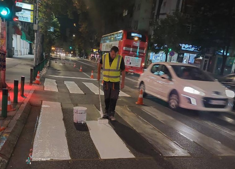 Екипите продолжуваат и во наредниот период со ноќното обележување на хоризонталната сигнализација по утврдената динамика од Град Скопје, како и со контрола и санација на сообраќајните знаци и опрема на сите места каде што има потреба за интервенции.