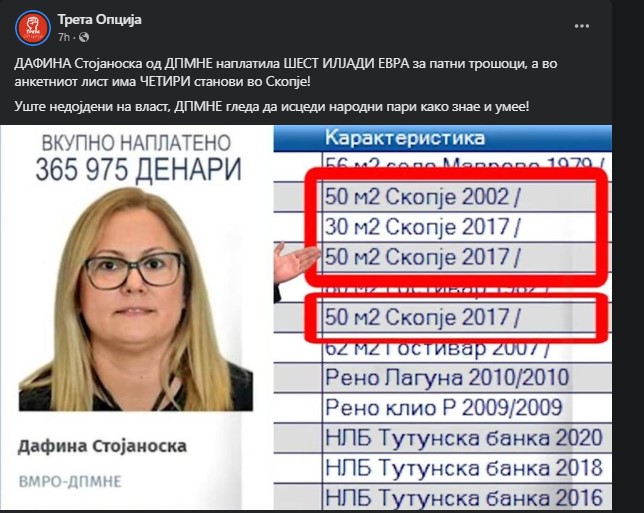 ,,ДАФИНА Стојаноска од ДПМНЕ наплатила ШЕСТ ИЛЈАДИ ЕВРА за патни трошоци, а во анкетниот лист има ЧЕТИРИ станови во Скопје!