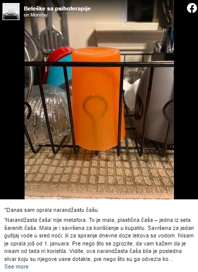 „Портокаловата чаша“ не е метафора. Тоа е мала пластична чаша – едно од комплетот шарени чаши. Мала е и е совршена за употреба во бањата. Совршена за голтка вода среде ноќ или за пиење на дневната доза на лекот со вода. Не сум ја измила од 1-ви јануари.
