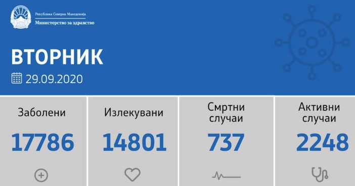 Вкупната бројка на ковид дијагностицирани во нашата земја од почетокот на епидемијата изнесува 17786, бројката на оздравени пациенти е 14801, на починати е 737, а во моментов бројот на активни случаи во земјата изнесува 2248.