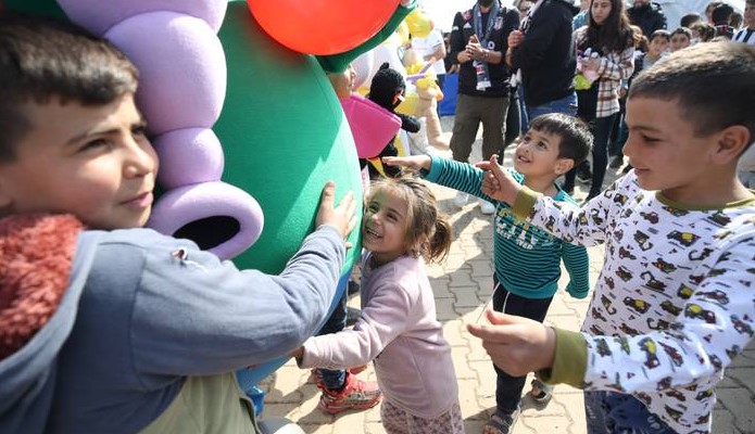 Играчките им беа поделени на децата сместени во шаторски камп што го постави Фудбалската академија на Бешикташ во спортски комплекс во областа Оникишубат.