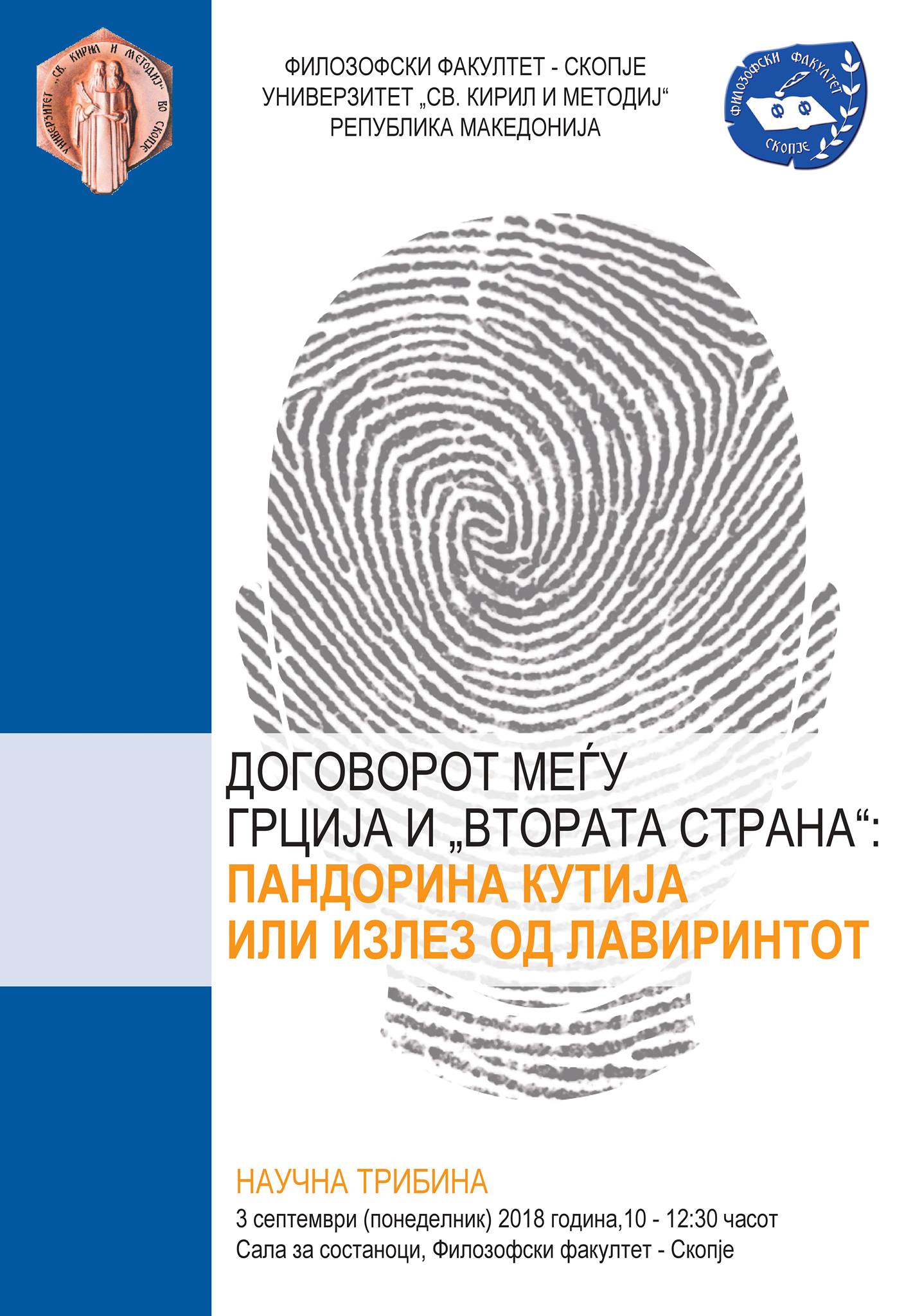 На Филозофскиот Факултет во Скопје на датум 3 Септмври 2018 година (Понеделник) на Универзитетот Свети Кирил и Методиј ќе се одржи Научна Трибина со наслов договорот меѓу грција и втората страна ПАНДОРИНА КУТИЈА ИЛИ ИЗЛЕЗ ОД ЛАВИРНИТОТ