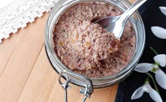 Прелијте ги со 200 мл зовриена вода урмите, кајсиите и брусницата. Оставете ги да отстојат 15 минути, исплакнете и исцедете ги. Сите горенаведени состојки ставете ги во блендер и додадете го сокот од портокал. Мешајте додека не добиете еднолична смеса, префрлете ја во тегла и чувајте ја во фрижидер.