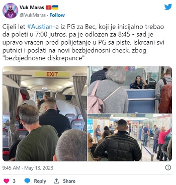 „Во Подгорица еден авион е вратен на дополнителна контрола. Во моментот полициски екипи прават контроли на аеродромот“, велат од аеродромот во Подгорица.
