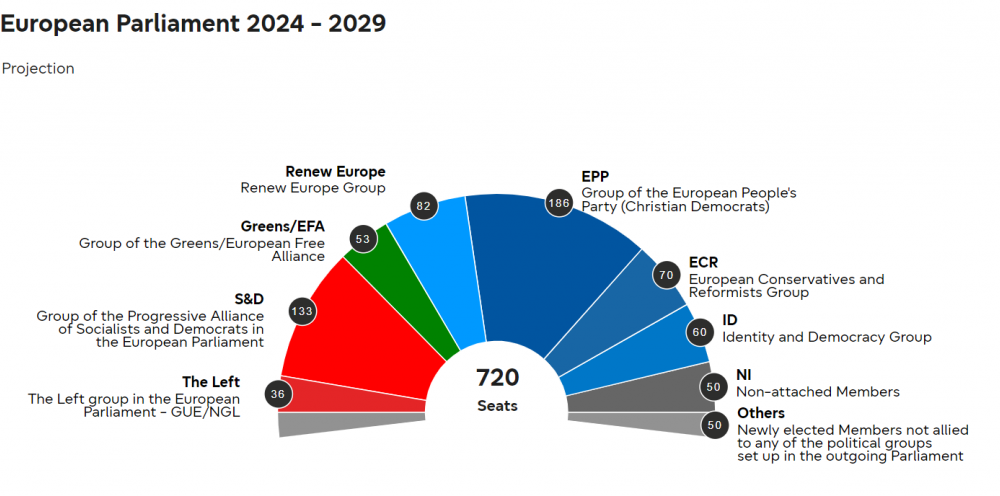 Според првичните проекции на бројот на освоени мандати, ЕПП предничи со 186 пратенички места во 720-члениот Европски парламент, што е подобар резултат од претходните избори кога освои 176 пратеници.