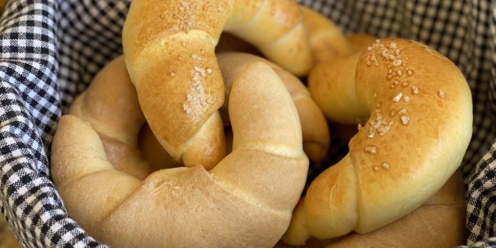 Премачкајте ги со разматено јајце, по желба посипете со сусам или ким. Печете во рерна загреана на 180 степени, додека не заруменат.