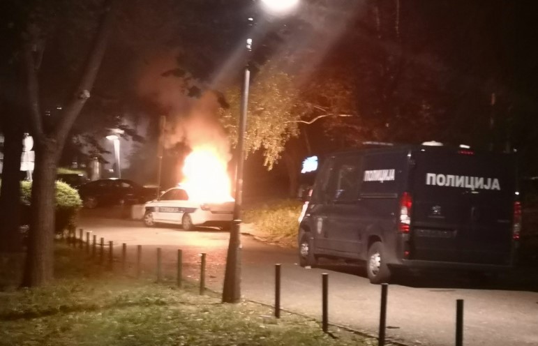 Запалена полициска кола од протестантите пред Собранието на Србија во Белград, демонстрантите не се повлекуваат