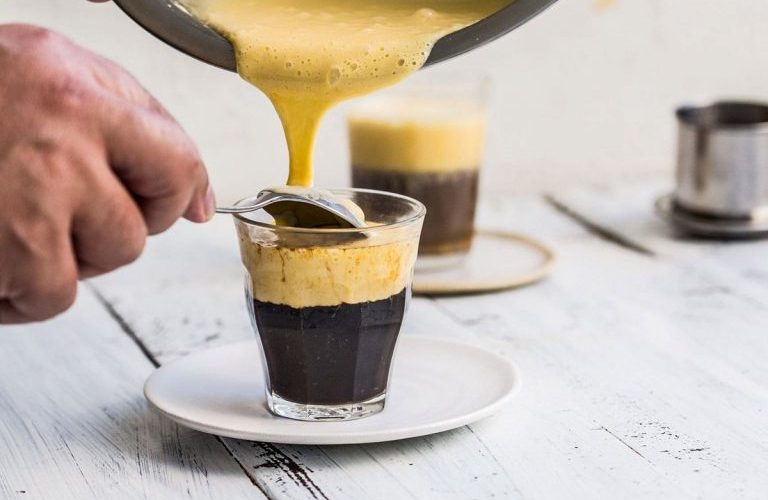 Што мислите за комбинацијата од кафе и јајца? Ca phe trung или виетнамско кафе чија сладост се должи пред сè на жолчките кои се матат со слатко кондензирано млеко сè додека не се добие кремаста пена која полека се прелива во еспресо.