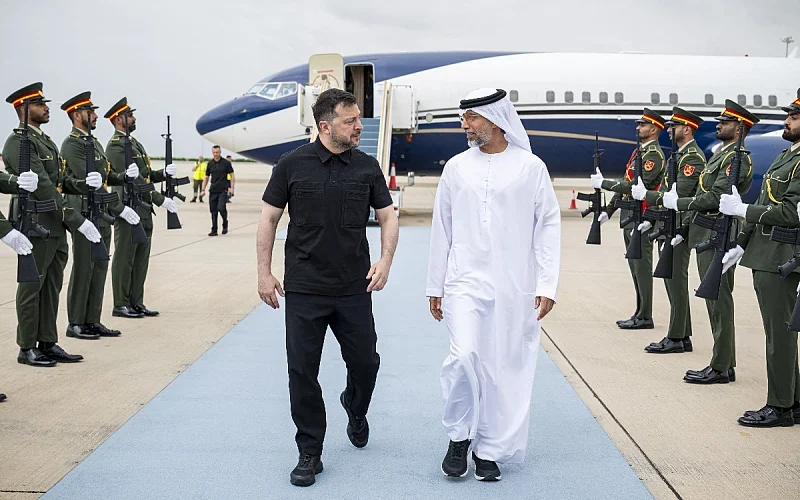 Претседателот на Украина, Володимир Зеленски, беше во работна посета на Обединетите Арапски Емирати, каде што се сретна со претседателот на ОАЕ, Мохамед бин Зајед ал Нахјан, во Абу Даби.