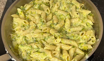 Сварете ги тестенините (ал денте), како и компирите. Изрендајте ги тиквичките, како и кашкавалот, а лукот ситно исечкајте го. На маслиново масло пропржете лук и тиквички. Исечете ги компирите, па ставете ги во блендер, посолете, додајте чедар и малку маслиново масло. Блендирајте додека не добиете компактна смеса. Во тиквичките додадете ги сварените тестенини и пирето од компири. Добро соединете. Оставете на шпорет уште 2-3 минути.