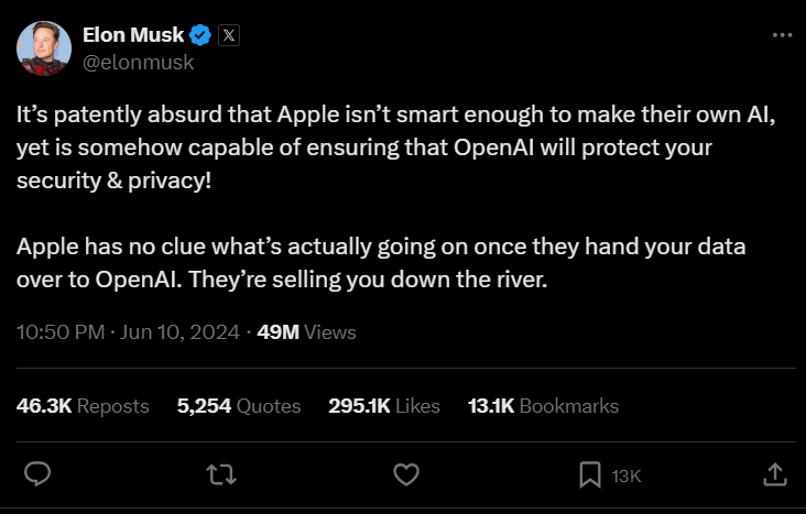 Неговите забелешки дојдоа откако Apple во понеделникот објави долгоочекувано партнерство со OpenAI, компанијата која стои зад генеративната алатка за вештачка интелигенција ChatGPT.