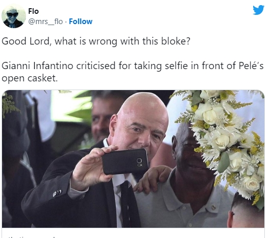 Еден ден подоцна, Италијанецот позираше со насмевка покрај ковчегот на Пеле и направи селфи, потег што наиде на критики во јавноста.