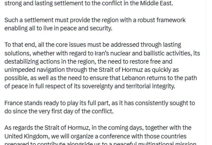 Францускиот претседател Емануел Макрон во најава на платформата X изјави дека земјата ќе организира конференција со Велика Британија и други држави за создавање мултинационална мисија за враќање на пловидбата во тој дел од светот.