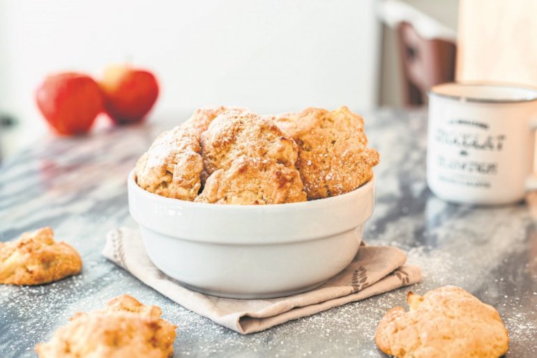 Измешајте ги овесните снегулки, брашното, шеќерот, скробот, циметот, прашокот за пециво и малку сол. Се додаваат ренданите јаболка, омекнатиот маргарин и млекото, се убаво се замесува, па од добиената смеса се формираат бисквити и се редат во плех обложен со хартија за печење. Се пече во рерна на 180 степени 15 минути.