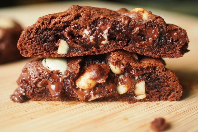 Исечкајте ги оревите или другите јаткасти плодови. Во сад изматете путер со шеќер и додајте јајце. Продолжете со мешање додека да се згусне смесата и стане пенлива. Додајте екстракт од ванила, брашно, какао, сол и прашок за печиво.