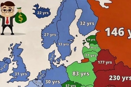 Кога станува збор за Македонија, таа е претставена со темноцрвена боја и бројот на потребни години изнесува 201 година. Во Србија таа бројка е 152 години, во Босна и Херцеговина 140 години, во Хрватска 87 години…
