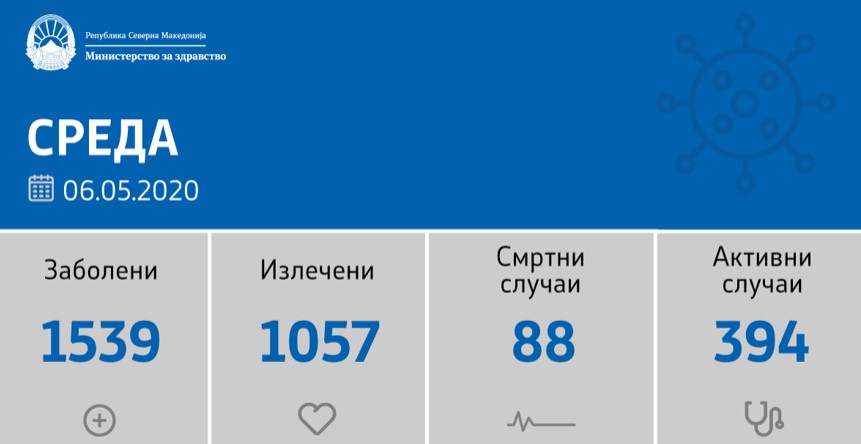 Вкупната бројка на дијагностицирани во нашата земја од почетокот на епидемијата изнесува 1539, бројката на оздравени пациенти е 1057, на починати е 88, а во моментов бројот на активни случаи во земјата изнесува 394.
