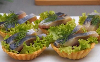 Цвеклото сварете го, па откако ќе се олади изрендајте го. Корпичките премачкајте ги со мајонез, а измиената зелена салата исечкајте ја и ставете ја внатре. Одозгора ставете една лажичка рендано цвекло, па две парчиња исечена чадена харинга.