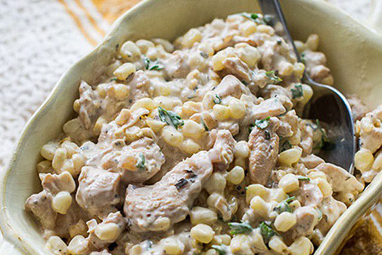 Сварете ги тестенините во солена вода, исцедете и оставете да се изладат. Сварете го пилешкото месо, а откако ќе се излади исечете го на коцки. Сварете ги морковот и пченката, па исечкајте го морковот на коцки. Сварете ги јајцата и исечкајте ги на коцки. Исечкајте ги пиперките и празот. Ставете сè во еден сад, а потоа додајте мајонез, павлака и сенф. Посолете и промешајте. Ставете во фрижидер да се излади.
