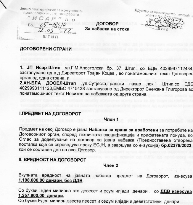 На 22 март оваа година Јавното претпријатие Исар од Штип склучува Договор за набавка на стоки со штипската фирма АН-БЛА ДООЕЛ Штип.
