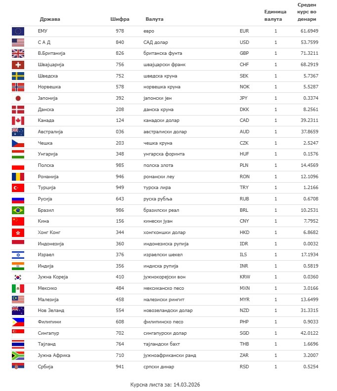 Вести Курсна листа на НБРМ: Колку чини еврото денес? Written by Леонардо More in Вести: Мицкоски до Беџети: Оваа влада нема да ви дозволи со ситен популизам да играте на чувствата на Албанците 30.April.2026 Демолирани училници во ОУ „Ванчо Прќе“ во Штип, полицијата на терен 30.April.2026 Посебен режим на сообраќај утре во Скопје поради протестот на ССМ 30.April.2026 Според курсната листа на НБРМ средниот курс на еврото денеска изнесува 61.6949 денари, а на американскиот долар 53.7599 денари. Средниот курс на британската фунта изнесува 71.3211 денари. Пронајдете не на следниве мрежи: