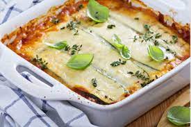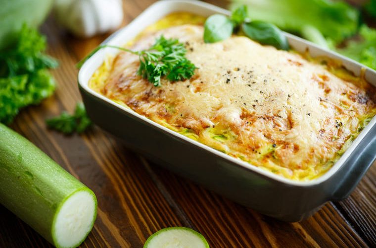 Покријте ја тавата со алуминиумска фолија и ставете ја во загреана рерна да се пече околу 15 минути. Потоа отстранете ја фолијата. Изматете 4 јајца со 100 мл млеко и прелијте ги тиквичките. Вратете се во рерна уште 15 минути за добро да се испече. Оладете малку, потоа исечете ги на коцки и послужете.