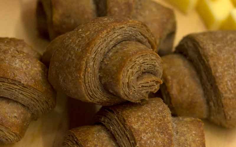 Се сече на 16 парчиња за кроасани од средна големина и се виткаат.