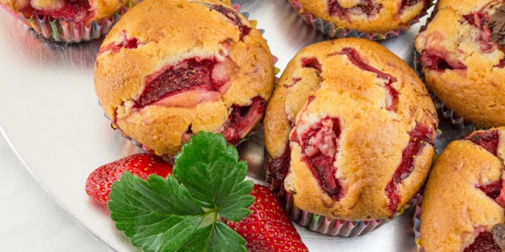 Додавајте едно по едно јајце и матете убаво по додавање на секое. Во смесата додајте го и брашното и јагодите и промешајте. Со лажица распоредете ја смесата во калапот за мафини и печете 20 минути на 180 степени.