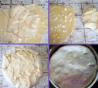 Ставете ја првата превиткана кора врз вториот развлечен круг, па превиткајте исто, така што ќе го опфатите и „пакетчето“ внатре, потоа повторно ставете ја втората кора врз третата, на која повторно ги превиткува краевите и така виткајте се додека да завршите со сите 10 развлечени теста (фотографиите од постапката се најдолу, под текстот).