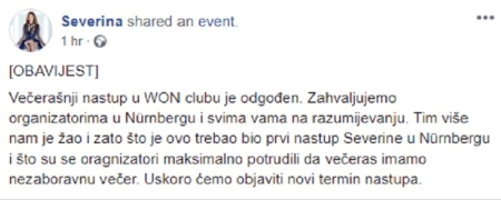 „Вечерашниот настап во клубот е откажан. Им се заблагодаруваме на организаторите во Нумбург и ви се заблагодаруваме на извинувањето. Ова беше првиот настап на Северина во Нимбург, а организаторите се потрудија да имаме незаборавна вечер. Наскоро ќе ги објавиме новите термини“, стои на официјалната страна на Фејсбук.