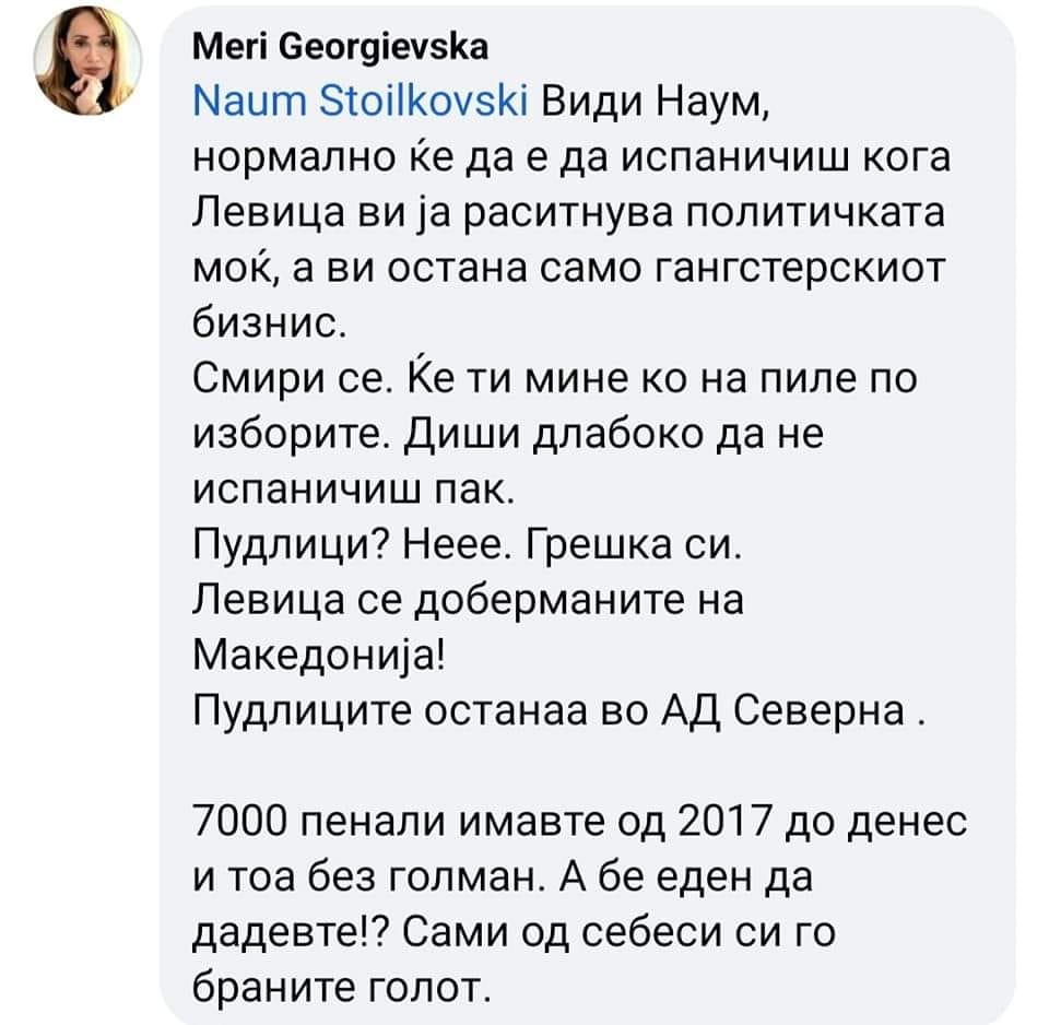 Ќерката на режисерот, дипломат, поранешен претседател на Собранието и претседателски кандидат од редовите на ВМРО-ДПМНЕ Љубиша Георгиевски, кој беше еден од највлијателните интелектуалции што таа партија воопшто го имала, го торпедираше портпаролот на ДПМНЕ Наум Стоилковски.
