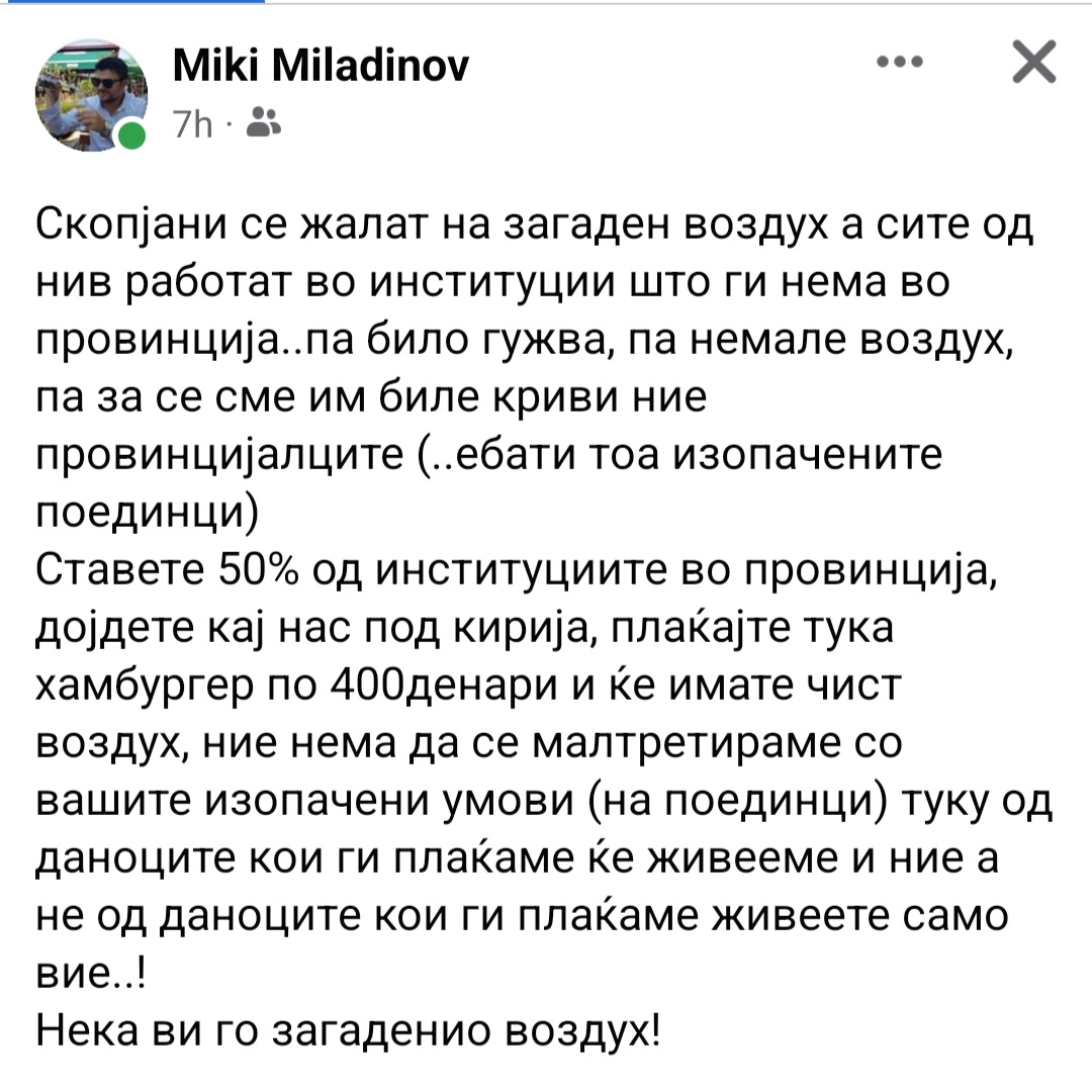 Скопјани се жалат на загаден воздух а сите од нив работат во институции што ги нема во провинција..па било гужва, па немале воздух, па за се сме им биле криви ние провинцијалците (..ебати тоа изопачените поединци)