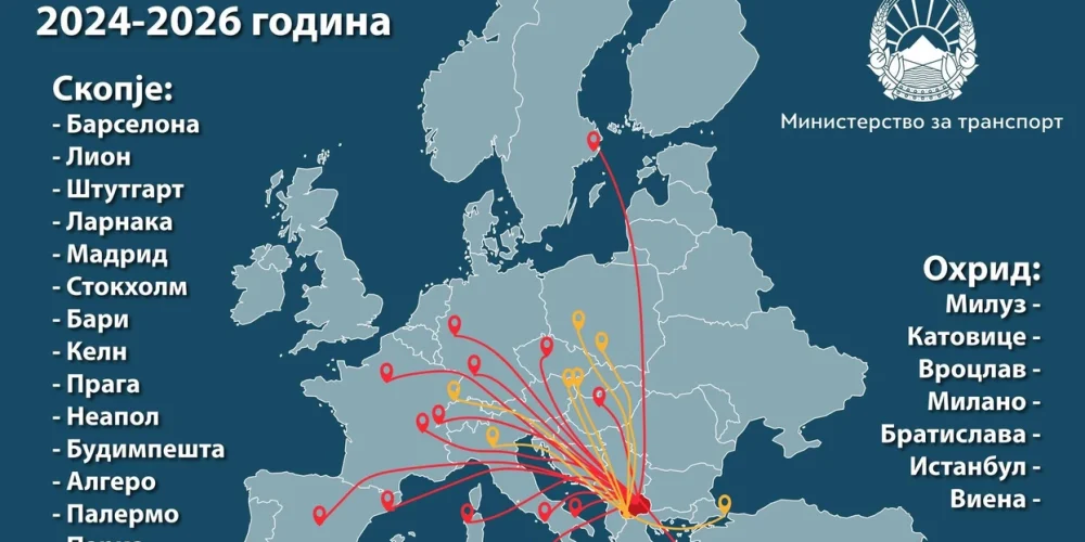 Отворени се 22 нови рути што ја поврзуваат Македонија со цела Европа, вели вицепремиерот и министер за транспорт Александар Николоски во објава на социјалните мрежи, споделувајќи мапа со нови авиокомпании поставени кон Европа од два домашни аеродроми од 2024 до 2026 година.