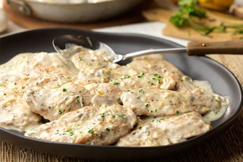 Додадете го месото во исечените филети. Додадете малку вода и динстајте додека не омекне, па запечете од двете страни. Извадете го месото и додадете го остатокот од маслото во тенџерето, додадете брашно и издробениот лук за да добие крем боја.